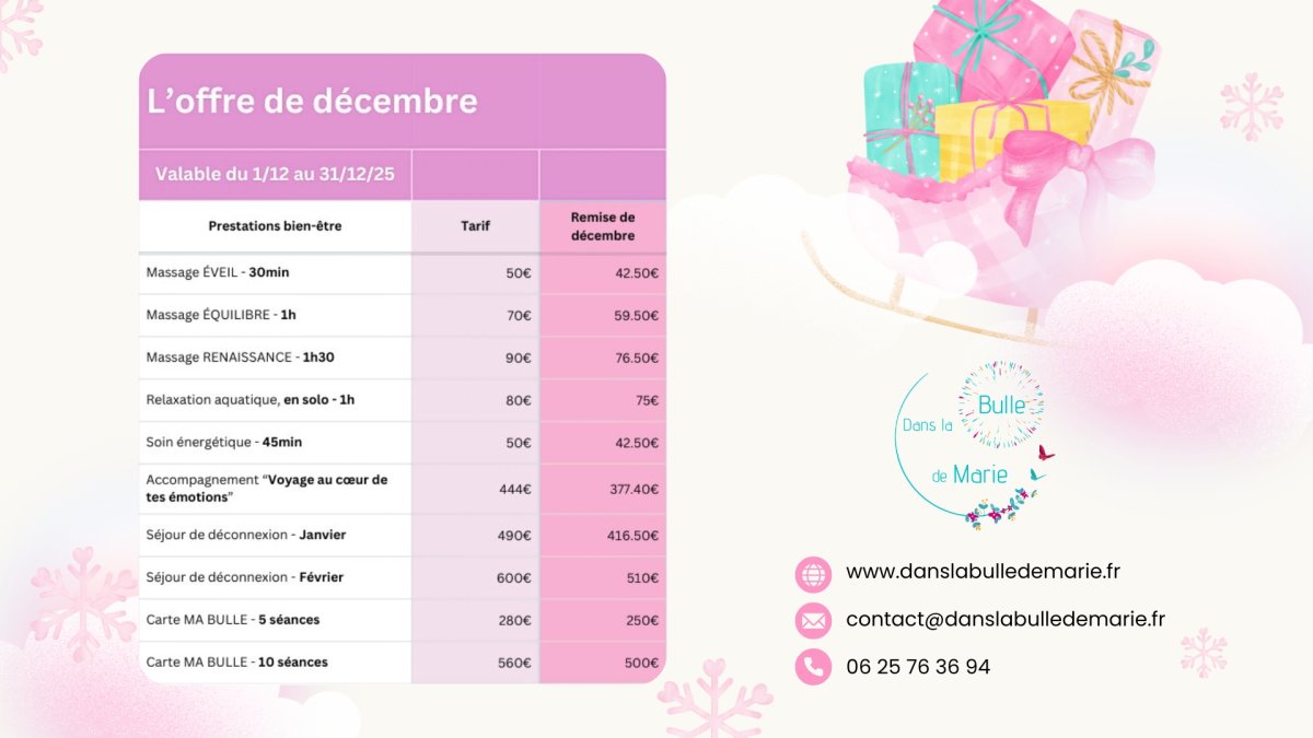 Vous trouverez ci-contre la fiche récapitulative de mes prestations, ainsi que les remises exceptionnelles de décembre.
